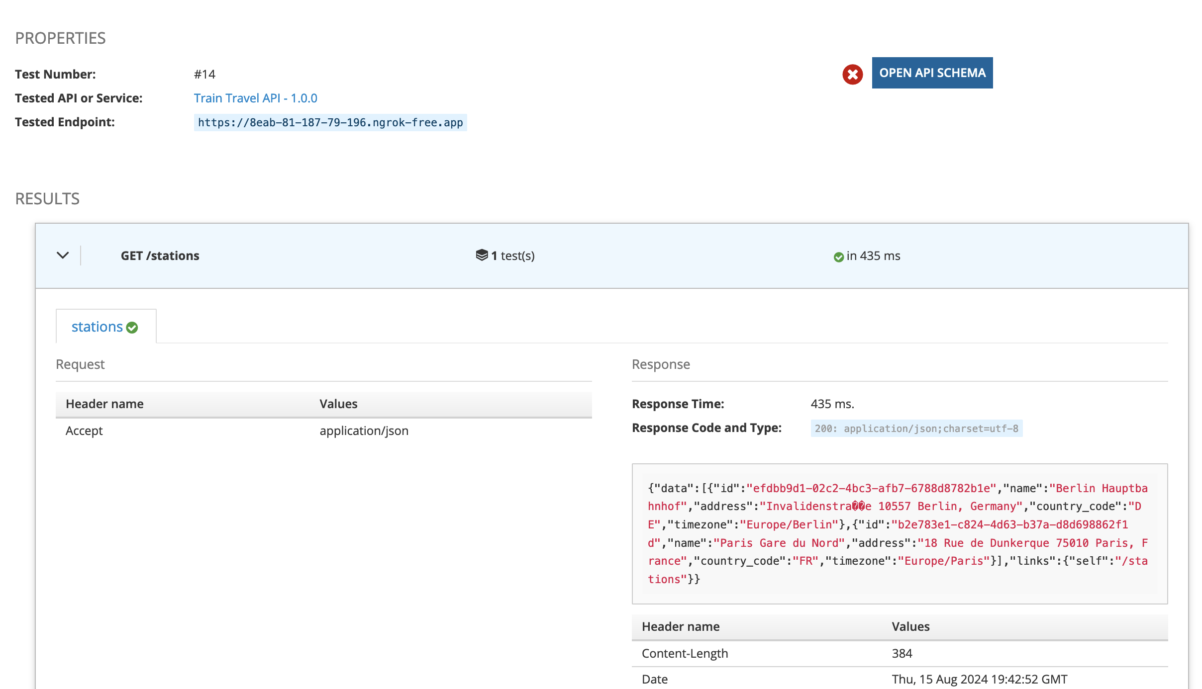 Here the contract testing has highlighted an important mistake: OpenAPI says that a 201 is supposed to be returned, but a 200 is being returned instead! Is the API wrong or is the OpenAPI wrong? You can now decide, and change one or the other, then run the tests again.
