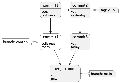 When your colleague needed to start her work last week, she did not have to ask you for the latest release: she just picked up the files from branch main (commit1 at the time). Today, she delivered her work in the separate branch “contrib” and asked you to integrate her work into main.