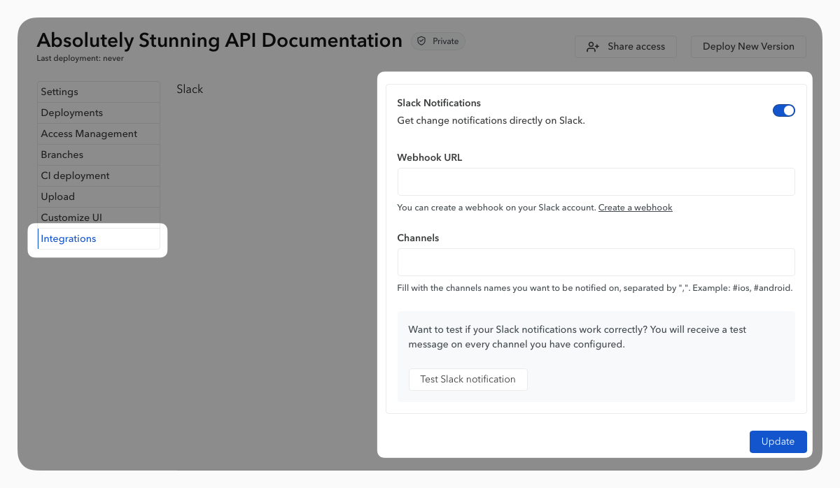 - Once you have copied the webhook URL, go to the settings of your documentation, in the Integrations tab, enable the Slack option, and provide the previously obtained webhook URL.