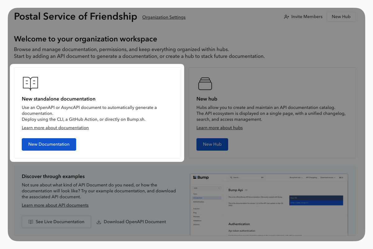Now that your Bump.sh account is created, you will immediately be prompted to create your first organization. An organization allows you to work alone or collaboratively on your API documentation and hubs (a collection of documentation) within the same workspace.
