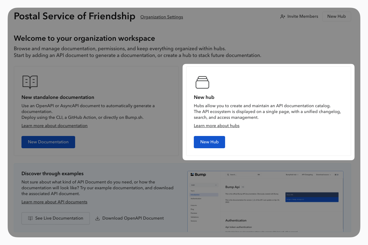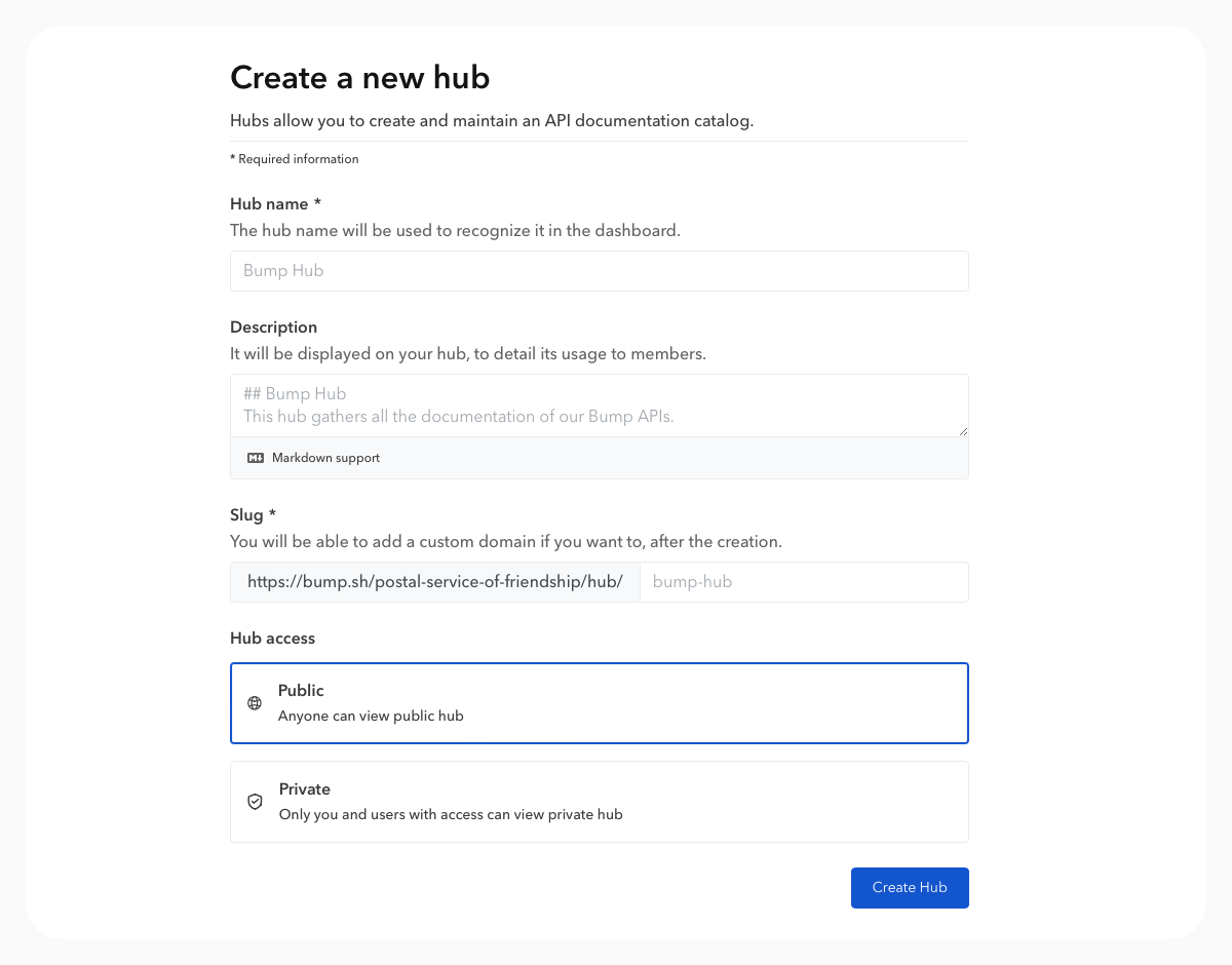 - By default, on Bump.sh, your hub will be available on this URL https://bump.sh/hub/