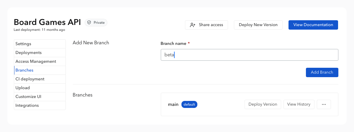 From the documentation settings, the Branches section allows you to create branches. Enter the name of the new branch and confirm. You can also create branches directly with our CLI or our API.