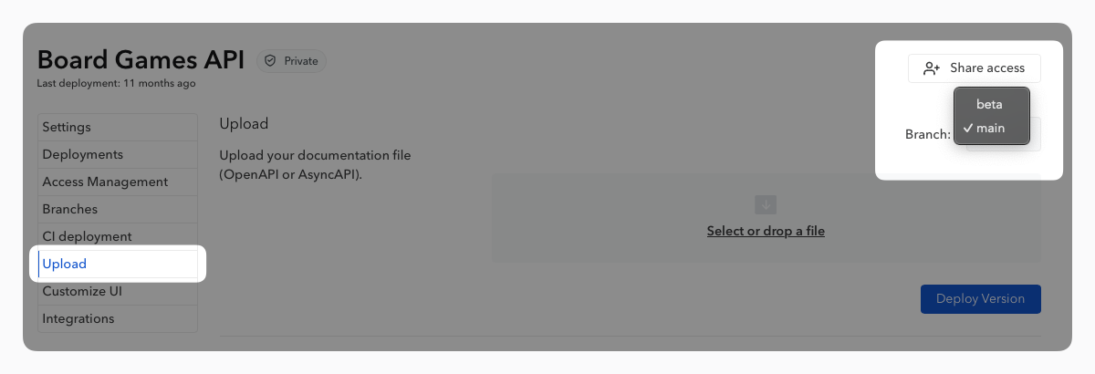 From the documentation settings, in the “Upload” section, select the branch in which to deploy the API definition before confirming the upload.